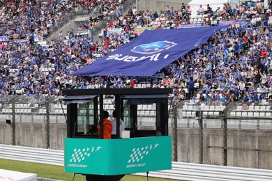 グランドスタンドでは各ファンシートから、ビッグフラッグによる応援が行われています。「SUBARU」「LEXUS」「ARTA」「Keihin」「Honda」とあり、今回「東海地区スバルグループ、スバル販売会社グループ一同、株式会社SUBARU、スバルテクニカインターナショナル株式会社」各位のご厚意により、本学1年生の学生をイベントに招待していただきました。応援席のどこかにいると思います。この場を借り、お礼申し上げます。