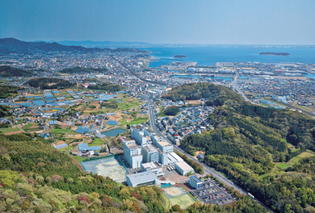 三河湾を一望する丘の上のキャンパスは、眺望抜群。敷地内には太陽光発電や風力発電の設備の他、モノづくりを実践的に学ぶための先端施設が集結しています。四季を感じられるロケーションで、先進の理論や技術を学べます。